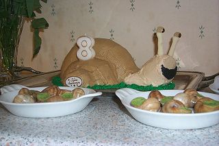 Since it was his birthday, Alex got to pick the menu. It was a simple one: snails, snails, and more snails. Lori accommodated his wishes with escargot in garlic butter for the first two courses with a snail cake for dessert. (We adults had escargot to start, followed by pork fillets--two full courses of escargot is a bit much!) The excitement of opening gifts ended a full and enjoyable day.